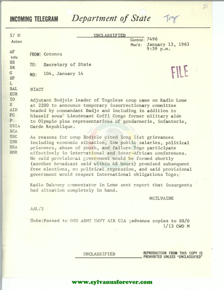 Cables diplomatiques échangés à partir du 13 Janvier 1963