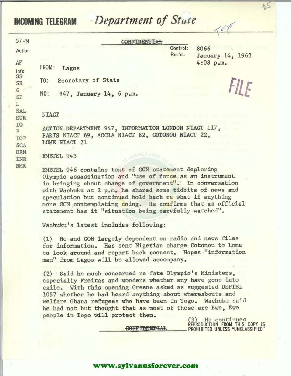 Cables diplomatiques échangés à partir du 13 Janvier 1963
