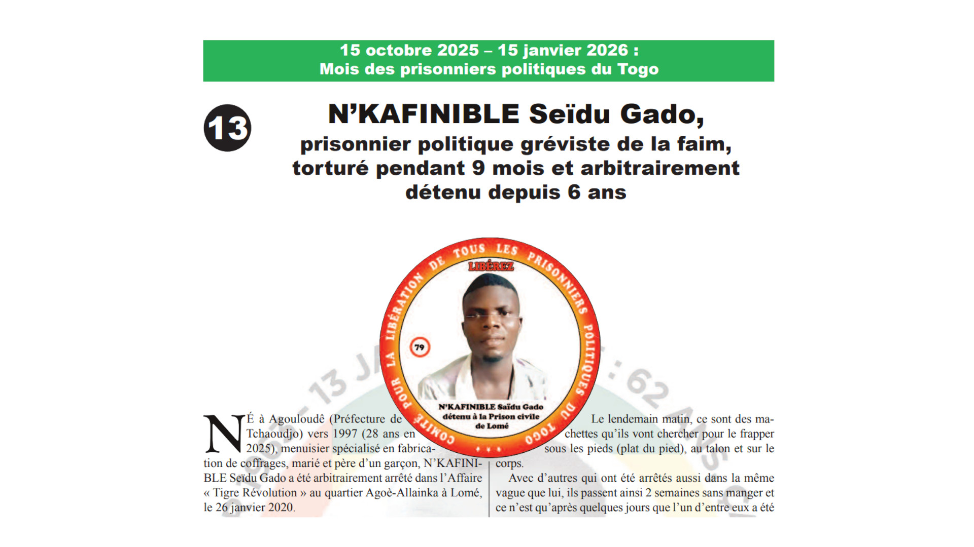 Commerçant et marabout, communément appelé « Alpha », faisant des consultations spirituelles à domicile, c’est avant même la manifestation du 23 novembre 2019 qu’on commence à le rechercher, après qu’un de ses clients ait cru devoir l’impliquer pour se sortir d’affaire alors qu’il est soumis à la torture par les gendarmes en charge de l’Affaire « Tigre révolution ».