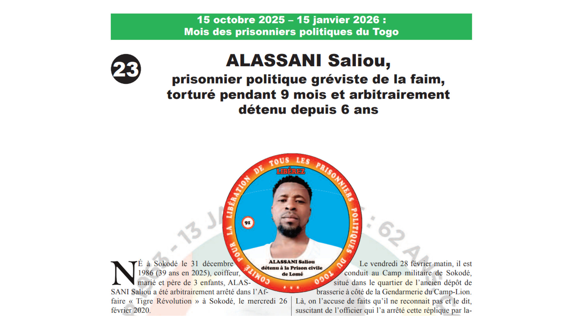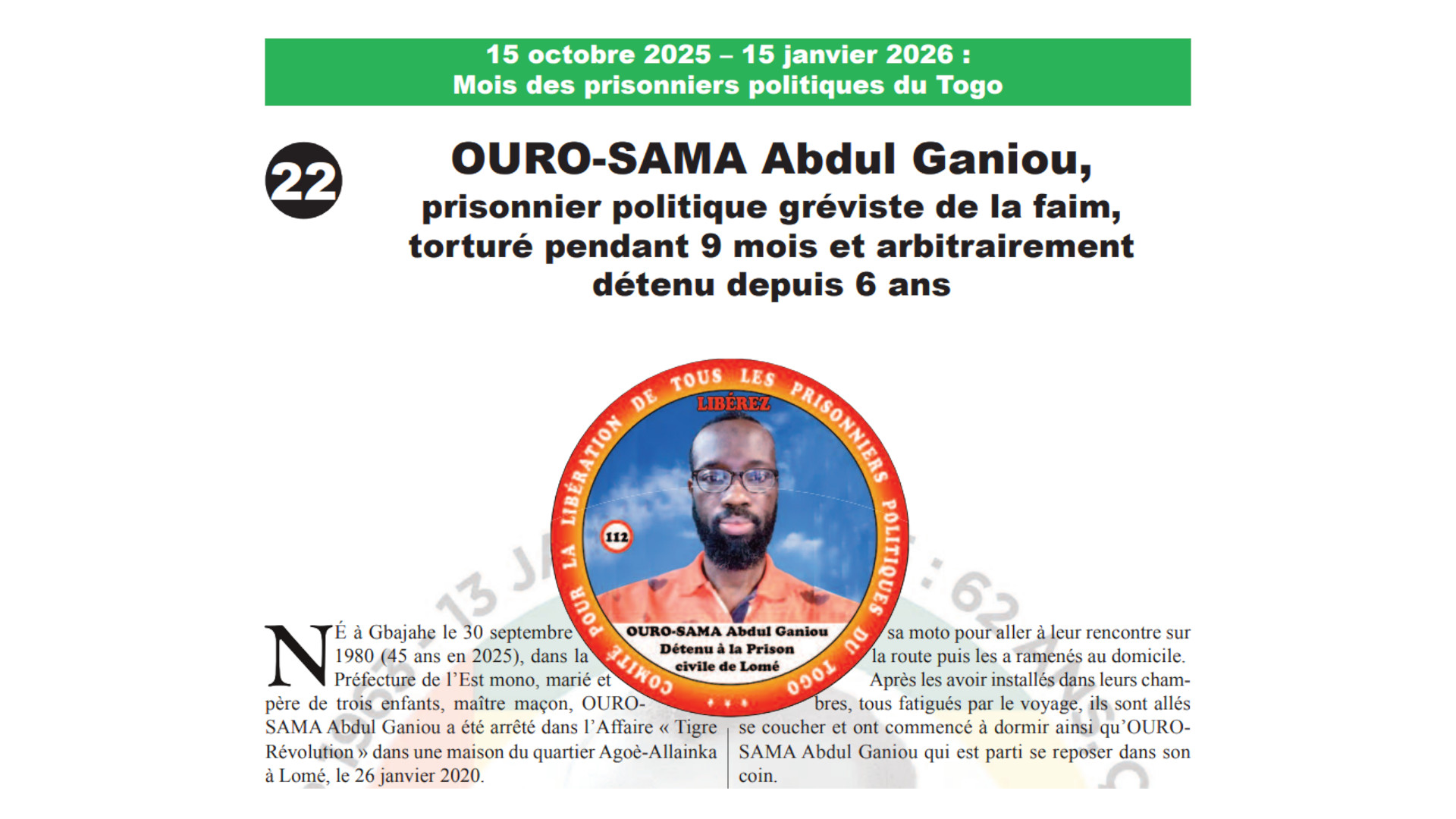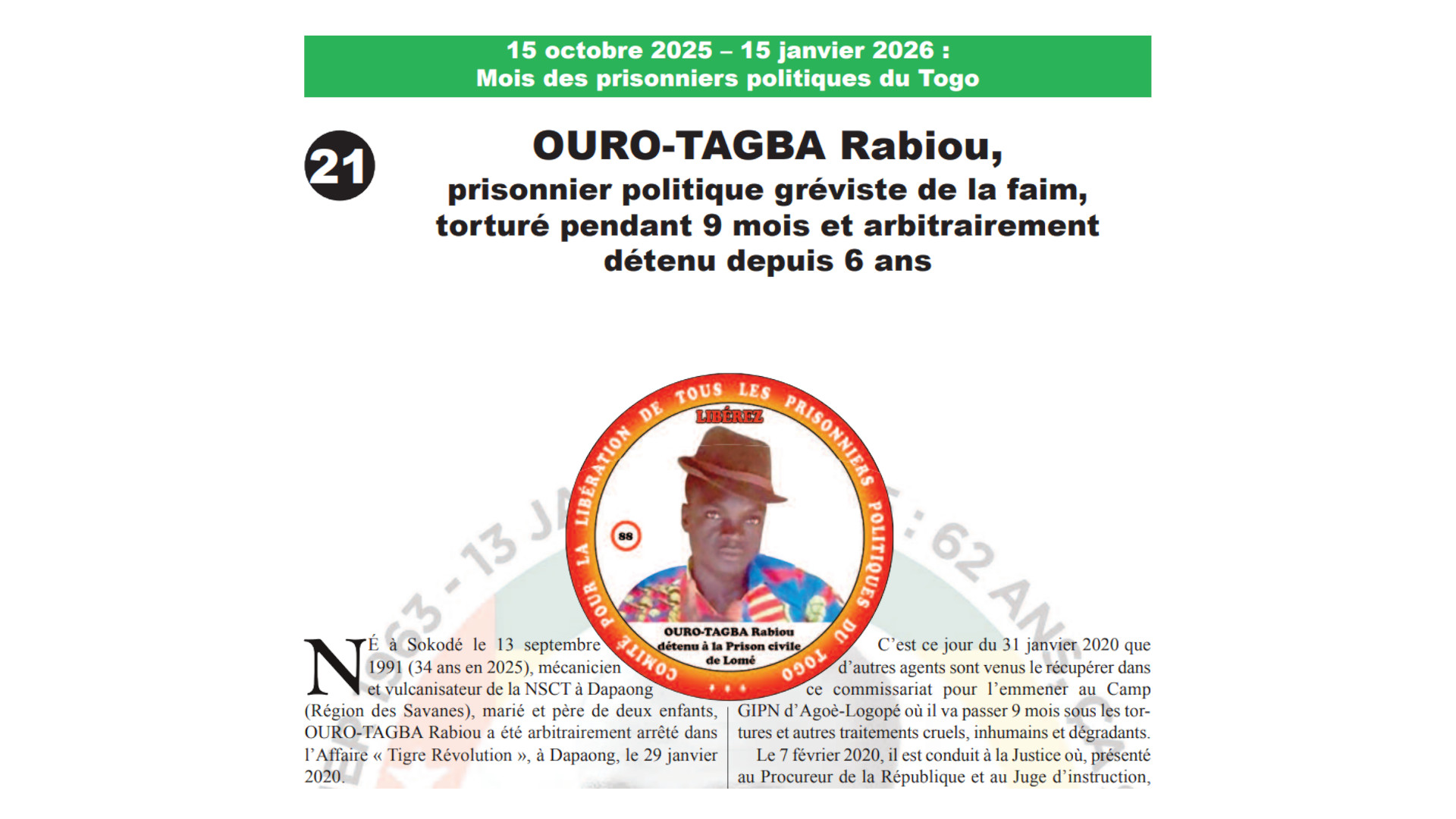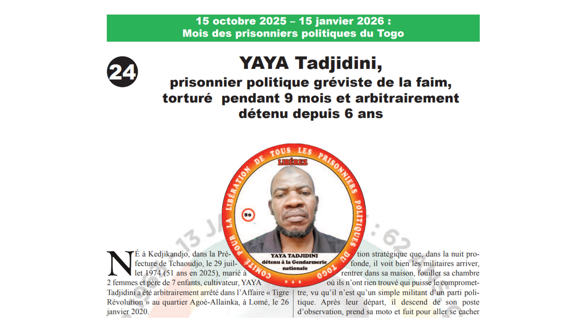 Militant politique très engagé du PNP, YAYA Tadjidini est présent à chaque marche pacifique se tenant à Sokodé mais, depuis quelque temps, son activisme politique est mal vu par le chef de son village de Kedjikandjo qui, de toute évidence proche du parti au pouvoir, l’a vendu aux forces de l’ordre au moment où une…